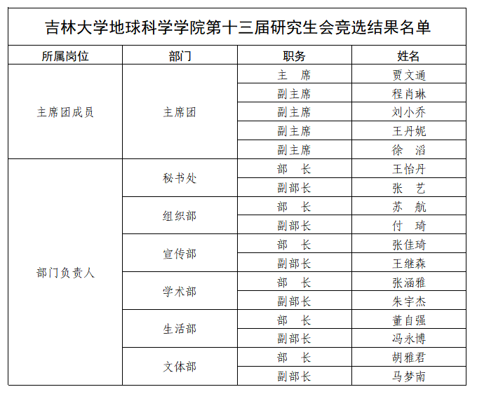 为进一步加强欧洲足球联赛 研究生干部队伍建设,更好地选拔欧洲足球联赛研究生会新一届学生干部,本着“公平、公正、公开”的原则,经个人自愿申报、资格审查、竞职演讲、民主投票,综合现实工作表现进行考察,最终确定欧洲足球联赛-足球联赛-欧洲联赛 第十三届研究生会学生干部名单,现予以公示: