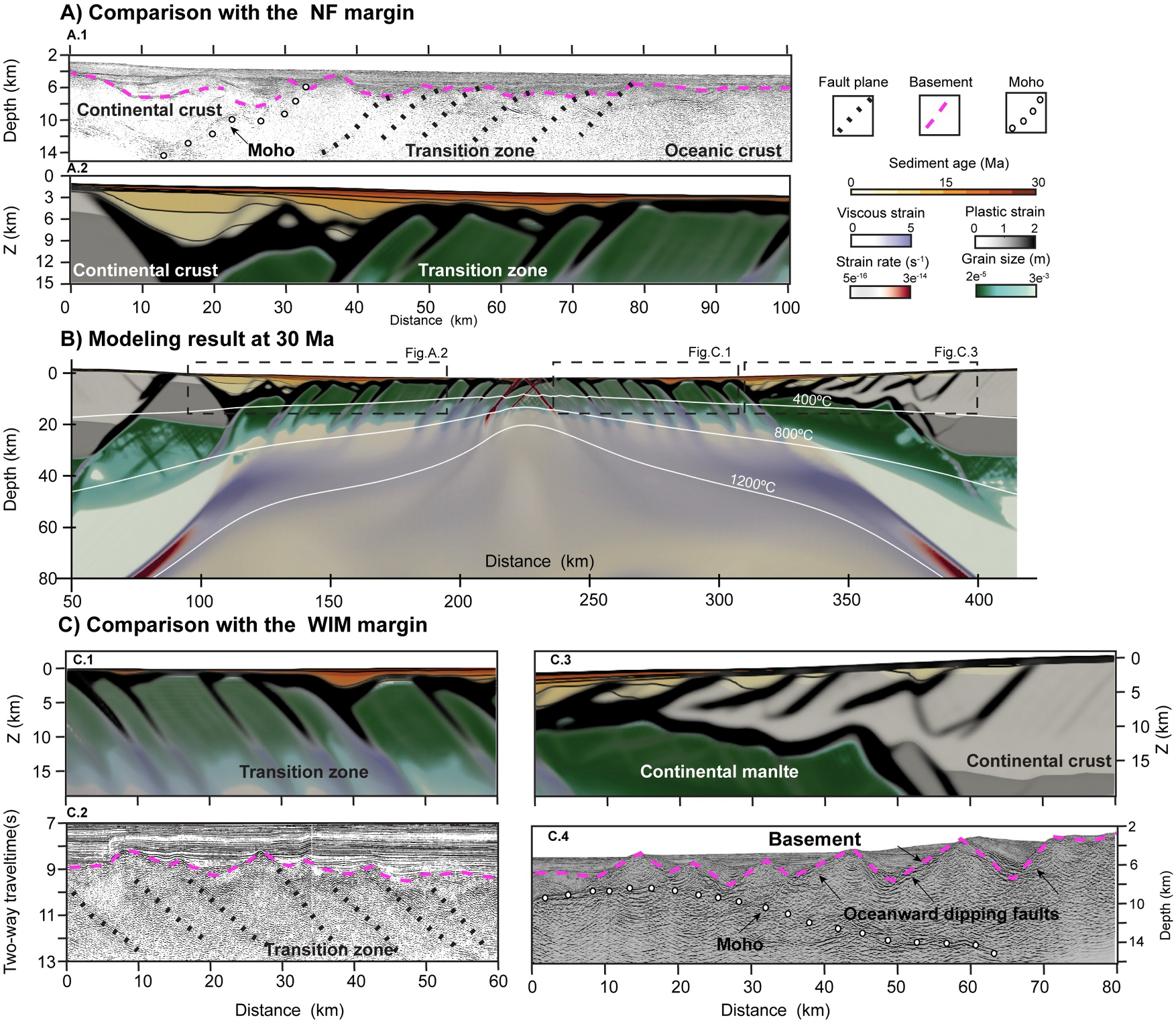 图2. 数值模拟结果与伊比利亚-纽芬兰被动陆缘的观测结果对比
