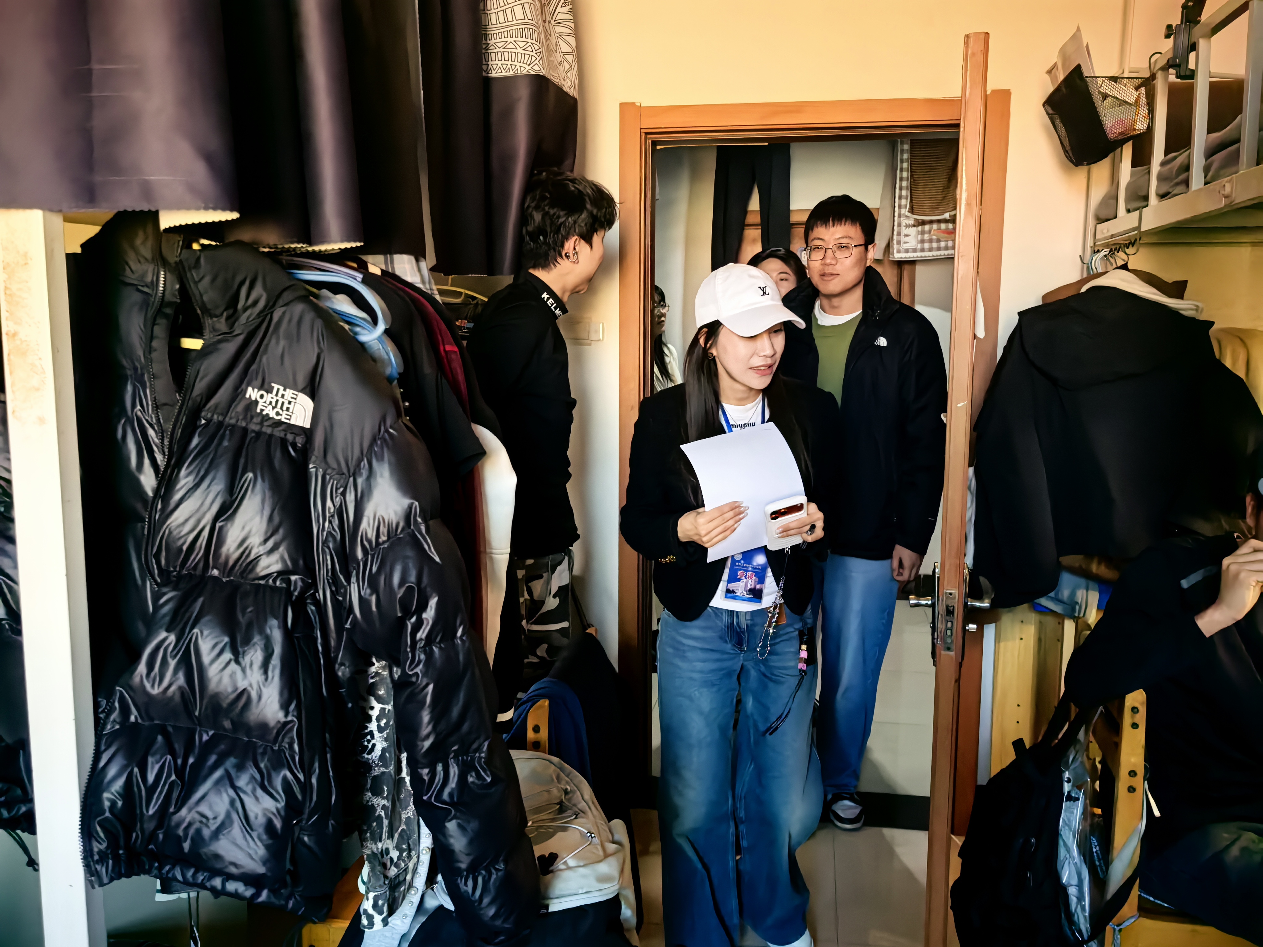 另外,老师们对宿舍整体整洁度、桌面物品摆放情况及卫生死角清理情况进行了检查。检查过程中发现,大部分同学能够自觉营造一个干净整洁的宿舍环境,将个人用品摆放整齐,但还有部分同学存在着物品堆放杂乱、寝室内堆积废旧纸箱等问题,存在一定的安全隐患,老师对此进行现场指导,要求同学立即整改,并强调了宿舍卫生和安全的重要性,引导同学们养成良好的生活习惯,共同营造舒适安全的住宿环境。