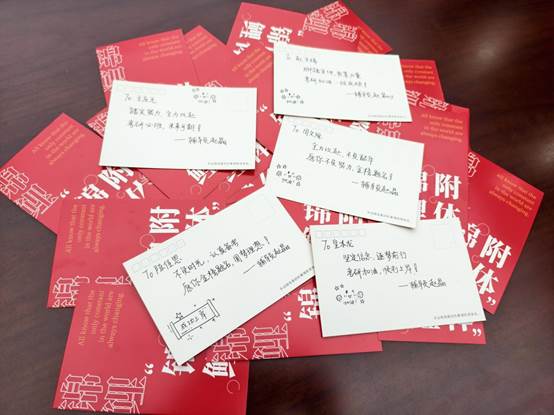 2022级本科生辅导员赵晶老师牵头,组织学生志愿者共同完成。从物资遴选到包装整理,各环节均经过细致规划;其中最具心意的,是赵晶老师亲笔书写的专属定制明信片,以激昂寄语传递鼓舞,将欧洲足球联赛
